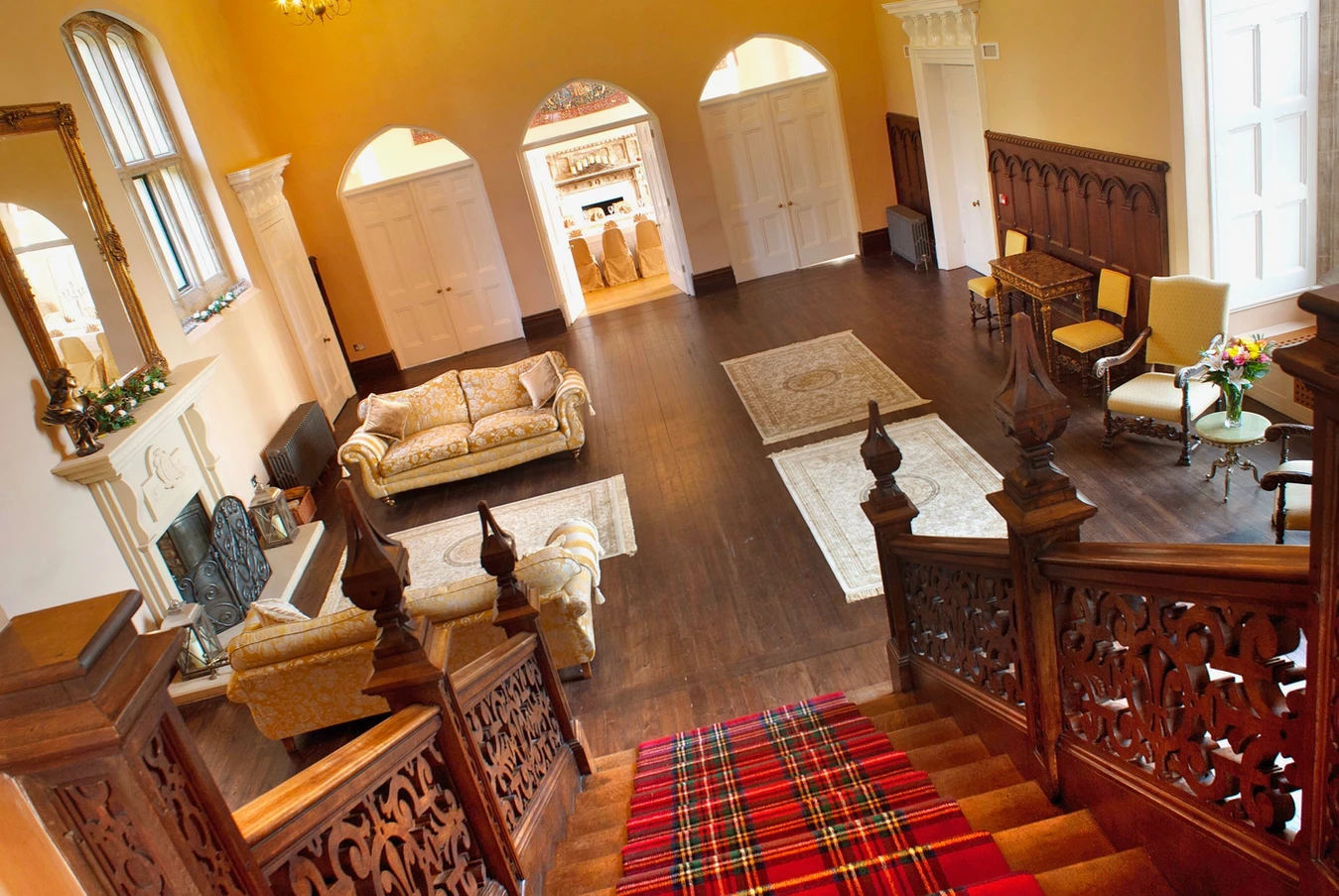 Stone mullioned windows on both sides of the hall allow light to flow in creating a bright and airy feeling creating the perfect ambiance to sit and relax with family and friends on the large comfortable seating area.